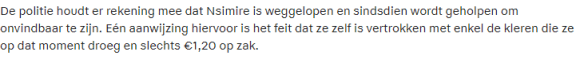 Een aanwijzing voor weglopen en het krijgen van onderdak is volgens de politie dus géén geld en géén kleding meenemen. Ik vind dit juist een alarmerend scenario. Dat duidt in mijn optiek niet op weglopen… Als je besluit om weloverwogen weg te gaan, dan neem je juist geld en kleren mee! Het kan uiteraard dat de politie meer aanwijzingen heeft, maar puur alleen dit gegeven is niet voldoende voor deze aanname.