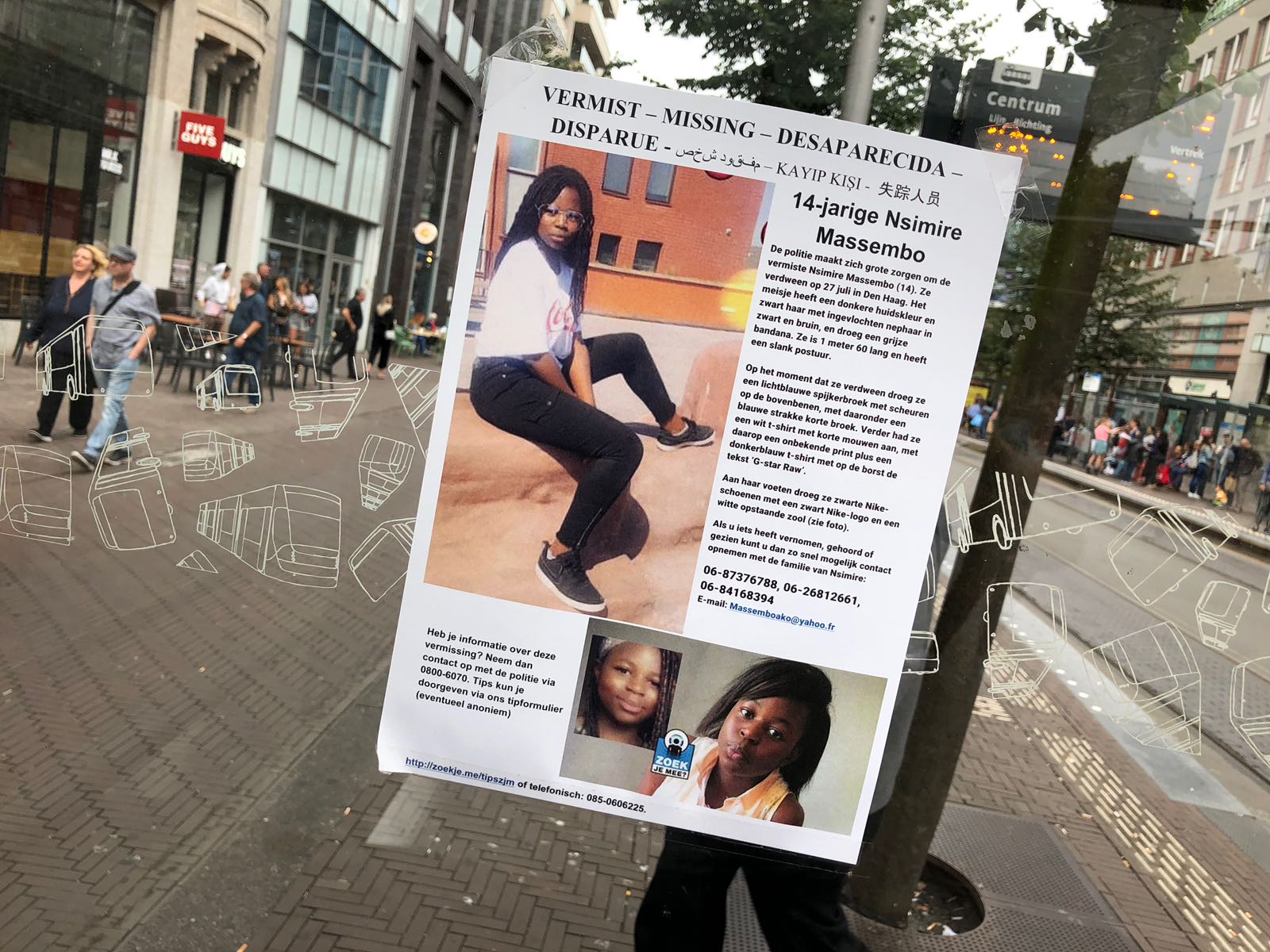 De veertienjarige Nsimire Massembo uit Den Haag is sinds vrijdag 27 juli vermist. Toch is er een aanknopingspunt: haar OV-chipkaart is in de nacht van zondag 29 juli gebruikt in bus 21 en tram 4. Er is met haar pasje uitgecheckt bij de halte Tienhovenselaan.