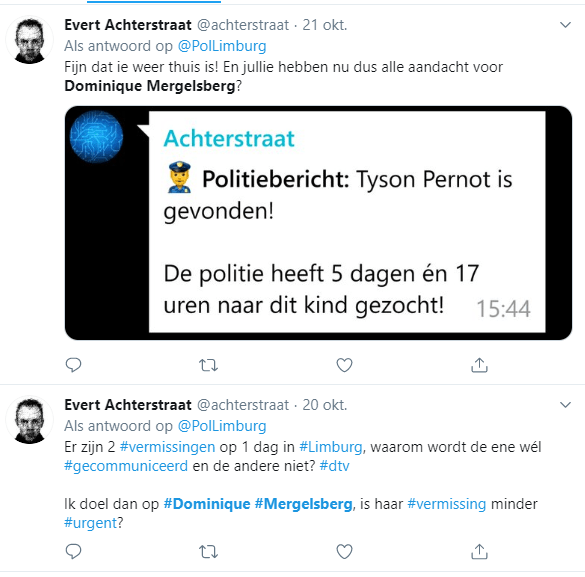 Op Twitter uit een betrokken lezer zijn ongenoegen aan de politie. Hij vindt het vreemd dat er weinig aandacht voor de zaak is. Is haar vermissing niet urgent, zo vraagt hij zich hardop af.