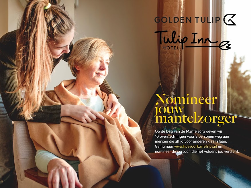 Bovendien wil Golden Tulip zijn waardering uitspreken voor alle mantelzorgers in Nederland. Iedereen kan kennissen of familieleden die actief zijn in de mantelzorg nomineren voor een gratis hotelovernachting inclusief ontbijt voor 2 personen in een van de Nederlandse hotels.