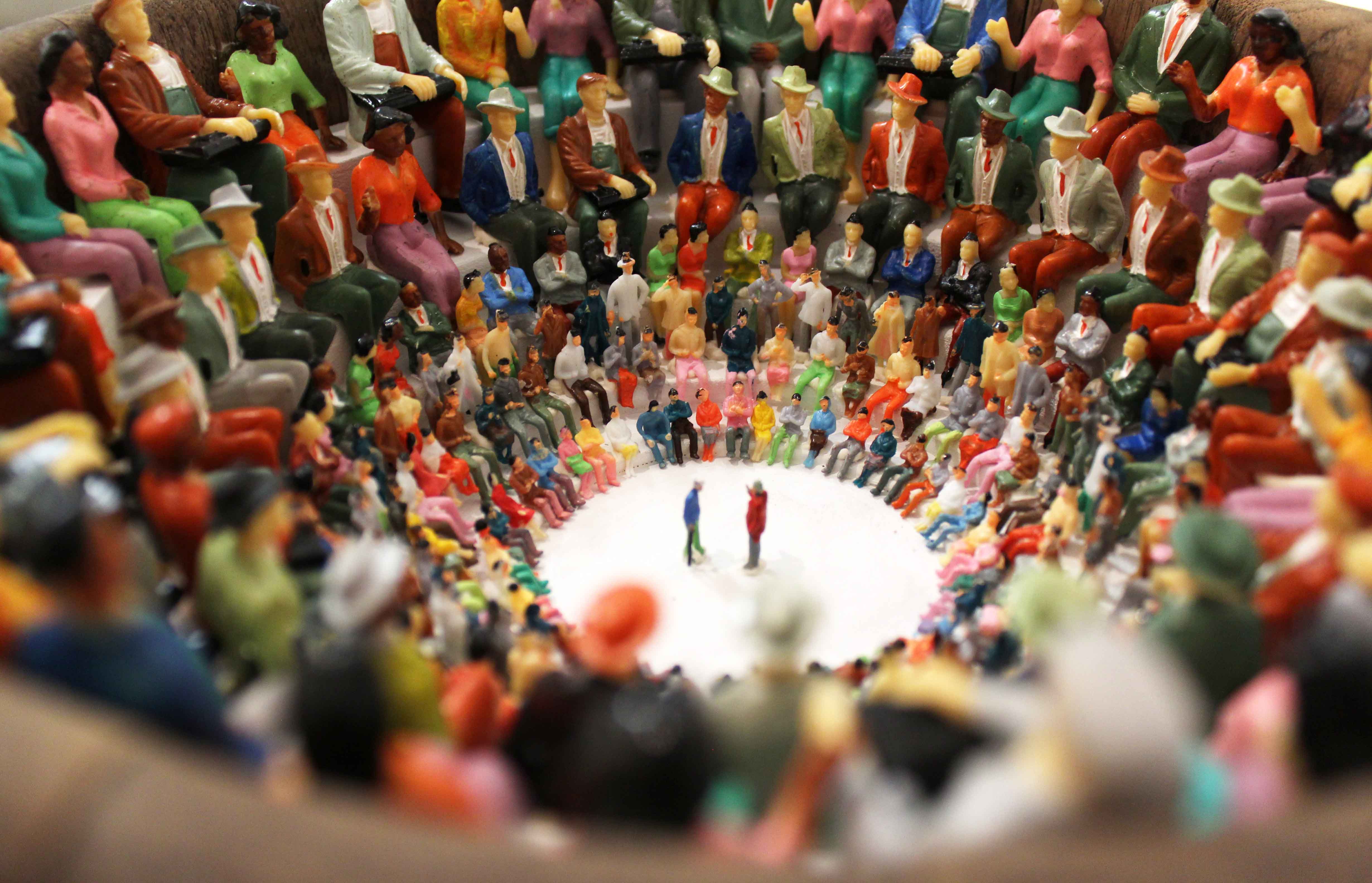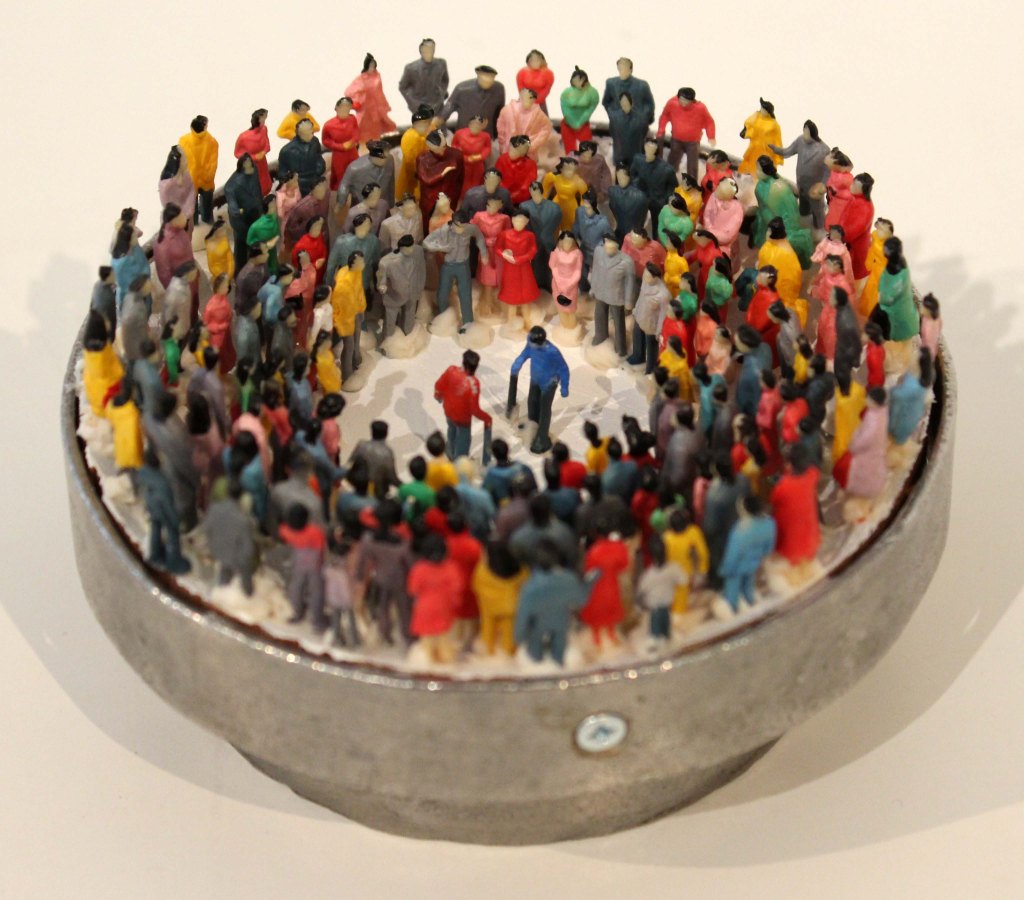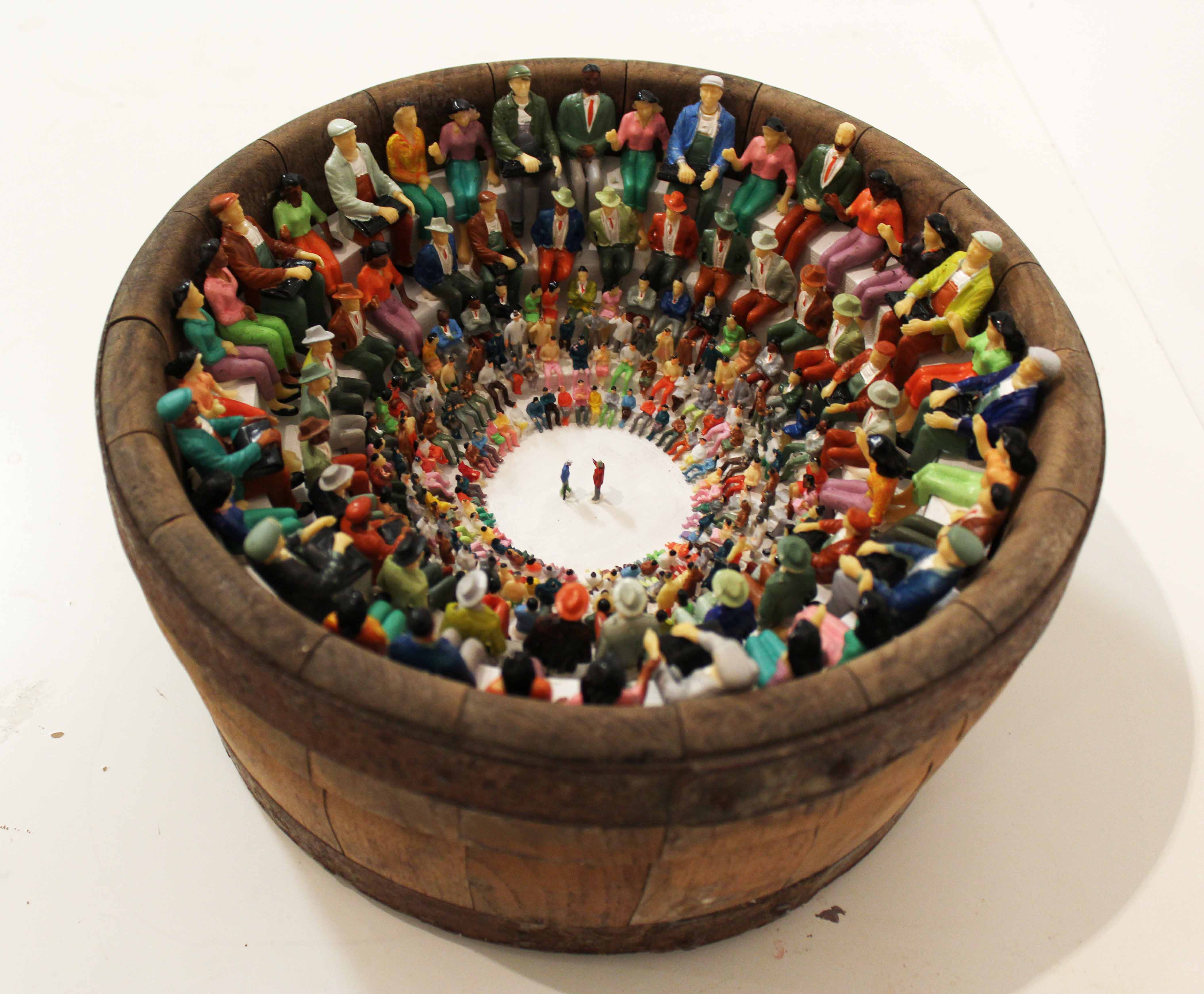 Zo maakte hij een kunstwerk dat doet denken aan een enorme arena, waar op het podium twee mannen met elkaar de strijd aanbinden. Door het gebruik van grote poppetjes in de bovenste ring en poppetjes die steeds kleiner worden als je naar beneden gaat wordt een duizelingwekkende diepte gecreëerd. In het strijdperk zelf zijn Biden, afgebeeld als oude grijze man met een blauw colbert en een wandelstok en Trump, ietwat obees en met een rood colbert en een oranje gezicht gemakkelijk te herkennen. Het tafereel doet denken aan de befaamde videoclip van Frankie Goes to Hollywood: “When two tribes go to war”. Dat is dan ook de titel van het kunstwerk. Een ander kunstwerk heeft eveneens een filmische achtergrond: “Political Fight Club”.