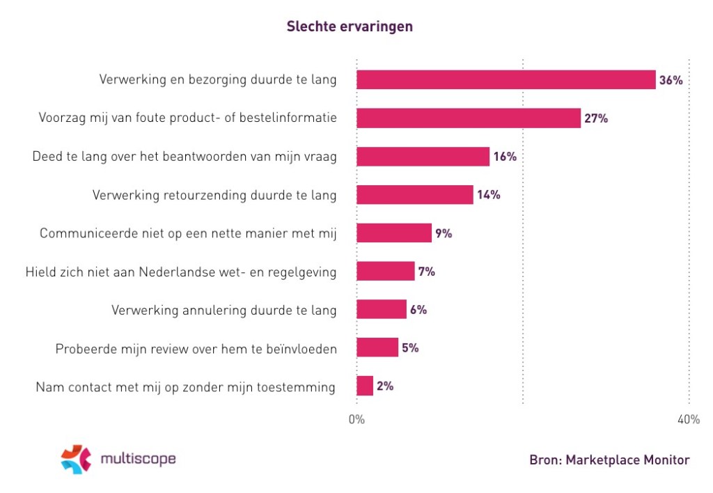 In totaal heeft een kwart van alle online shoppers slechte ervaringen gehad met externe verkopers. De meeste genoemde klacht bij online bestellingen via externe verkopers is een te lange verwerk- en bezorgtijd van de bestelling (36%). Iets meer dan een kwart van de slechte ervaringen heeft betrekking op foute product- of bestelinformatie (27%). Ook vaak genoemd zijn een te lange reactietijd op vragen (16%) en verwerking van de retourzending (14%).