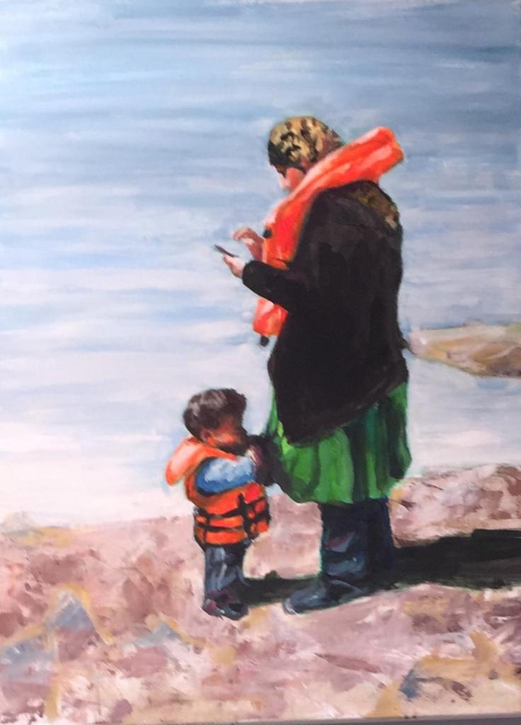 Hoop is een thema dat we in veel schilderingen terugzien. Kinderen die ondanks de omstandigheden spelen en vriendschappen sluiten. Een vrouw die in het kamp de was ophangt en met haar prachtige hoofddoek in het oog springt. Of een moeder met een peuter in zwemvest, die naar huis belt om te vertellen dat ze veilig zijn aangekomen op het schilderij van Frank van Polanen Petel.