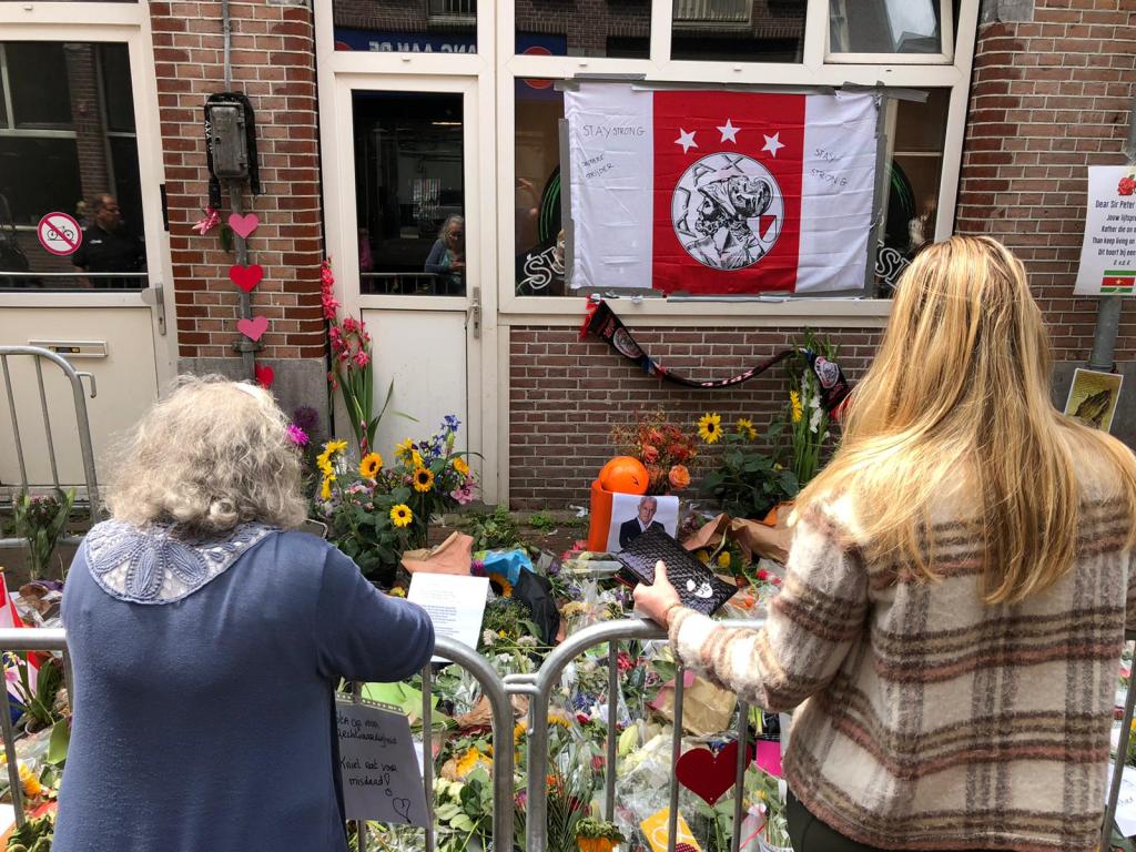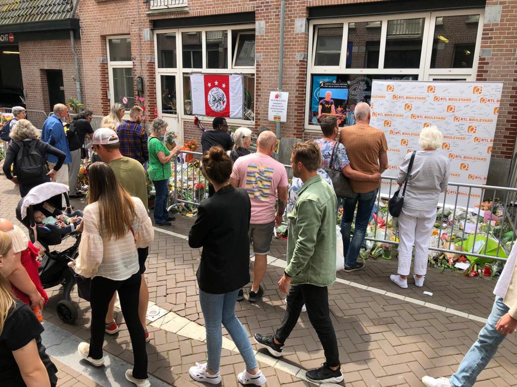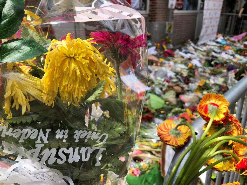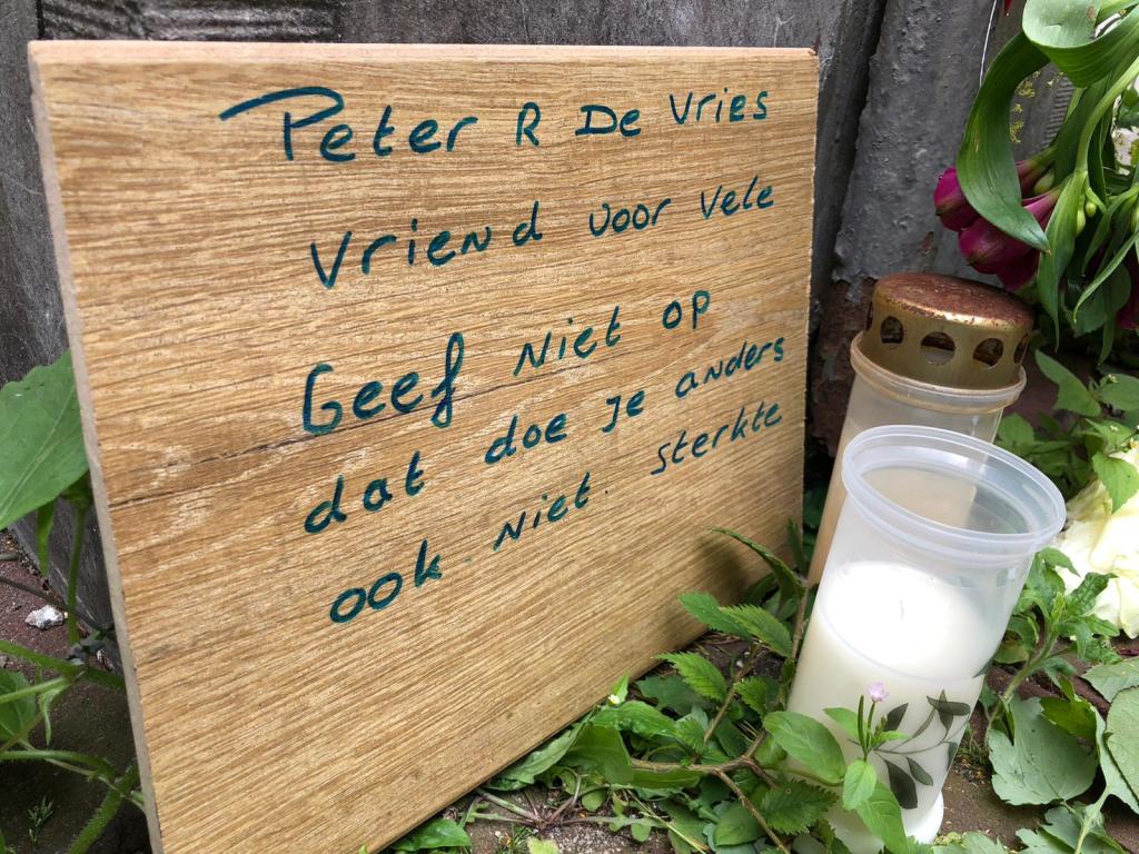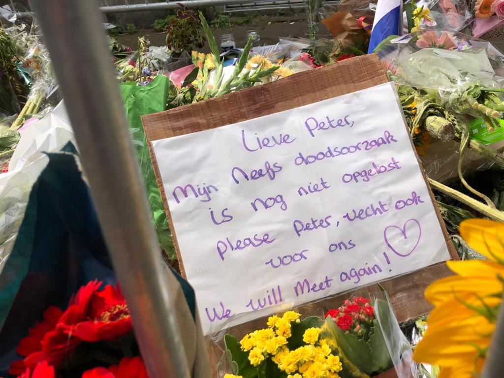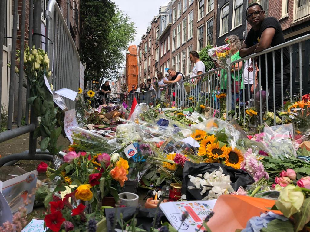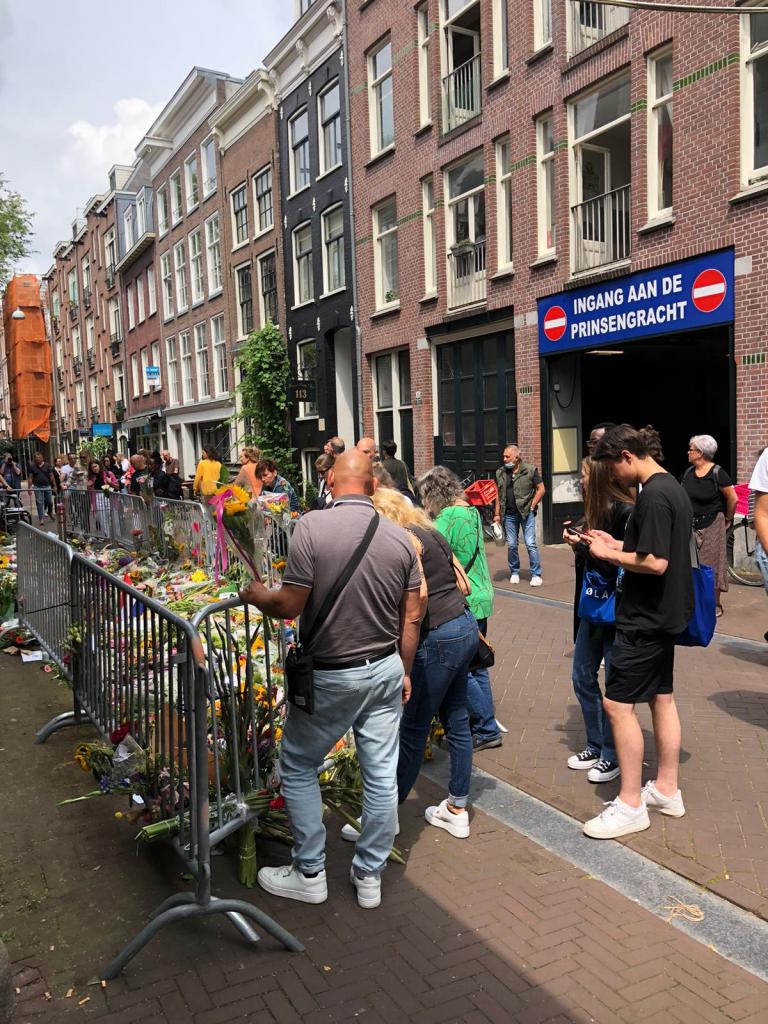 In de Lange Leidsedwarsstraat in Amsterdam waar misdaadverslaggever Peter R. de Vries werd neergeschoten werden zaterdagmiddag nog steeds bloemen gelegd en kaarsjes aangestoken.