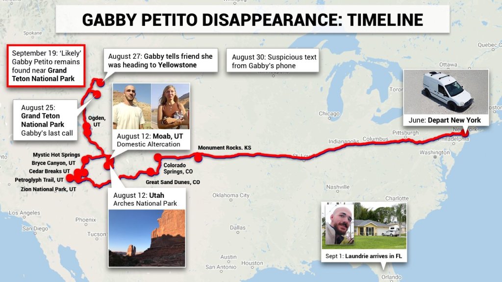 Op 25 augustus gaf Petito voor het laatst een update over de reis. Enkele dagen later kwam Laundrie in zijn eentje met hun auto terug in zijn woonplaats in Florida. Ondanks aandringen van haar ouders weigerde hij te zeggen waar Petito was gebleven. Op 11 september gaven haar ouders haar als vermist op.