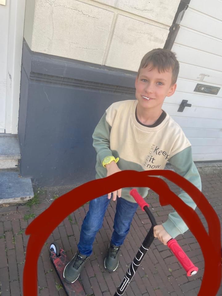Gino is 1,30 meter en heeft een rode jas met zwarte mouwen van het merk Jordan, een lichte spijkerbroek en groene schoenen met witte zool aan. Verder draagt hij een rode pet van het merk Nike. Gino heeft waarschijnlijk een zwarte step met rode handvatten en daarop rode stickers bij zich.