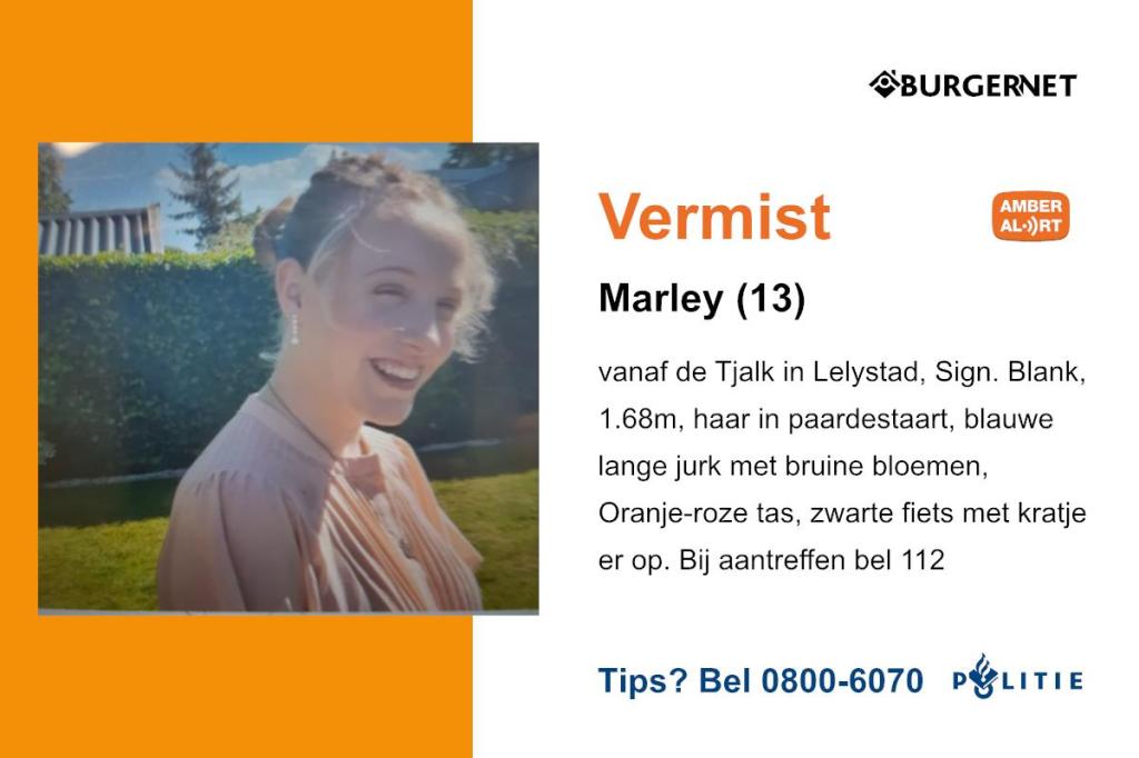 De politie in Lelystad is al de hele ochtend op zoek naar de 13-jarige Marley uit Lelystad. Het meisje is spoorloos vanaf het moment dat zij om negen uur op haar fiets vertrok vanaf de Tjalk.