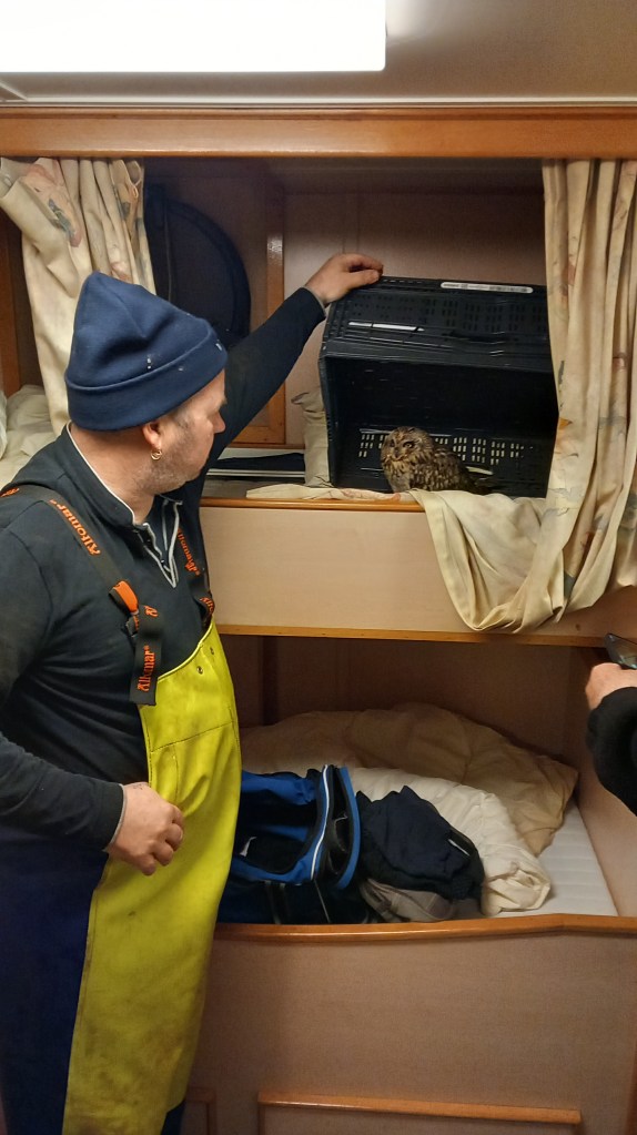 Vissers keken raar op toen ze veertig mijl vanaf de Nederlandse kust hun netten pakten om te gaan vissen, ruim twee weken geleden. Op het dek van hun vissersboot troffen ze een verzwakte velduil aan. De uil was nat van de golven die vanuit zee op het dek spatten. Om onderkoeling tegen te gaan hebben de vriendelijke vissers de uil veiliggesteld in een warme ruimte in een krat, met wat dekens.