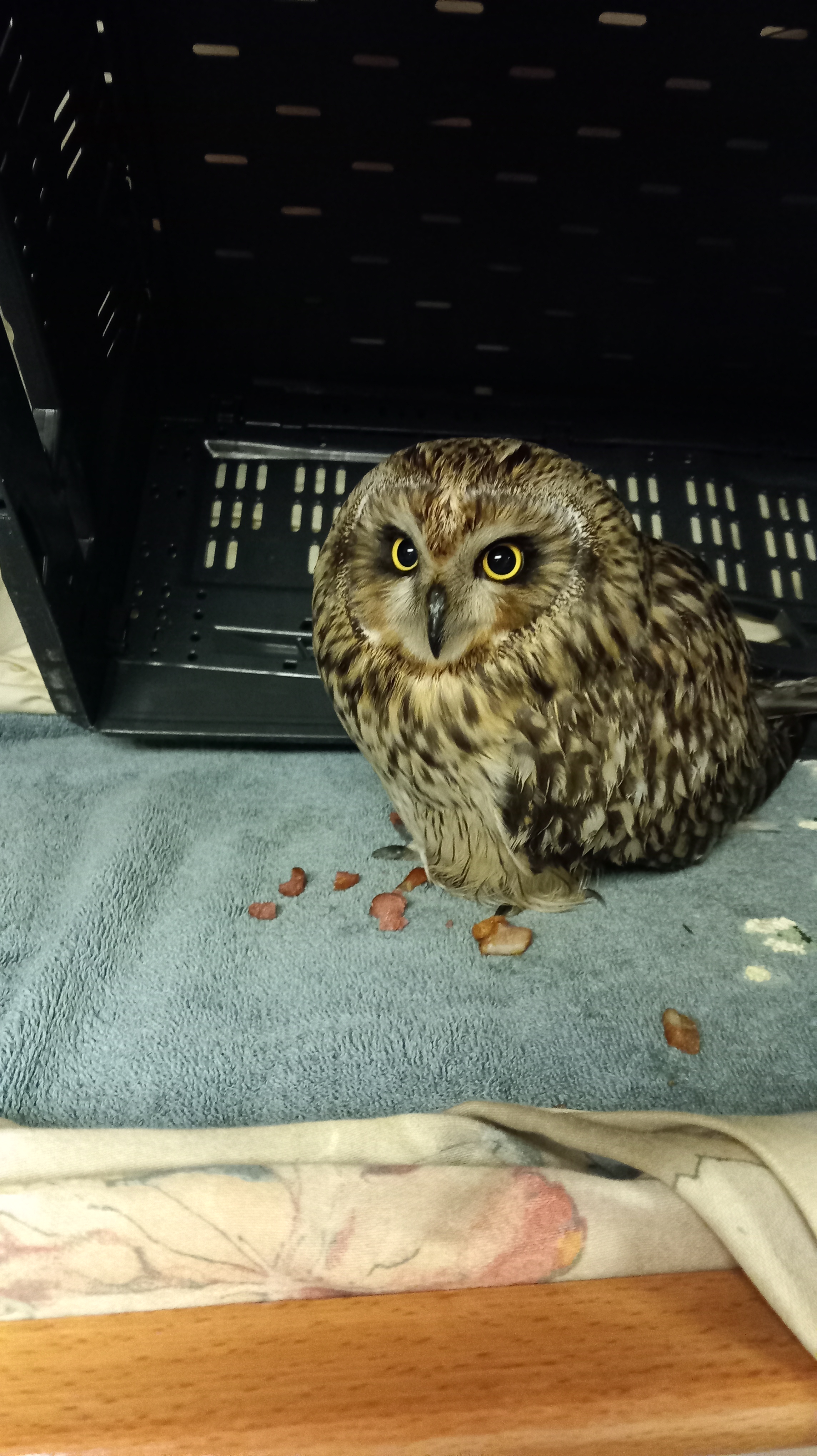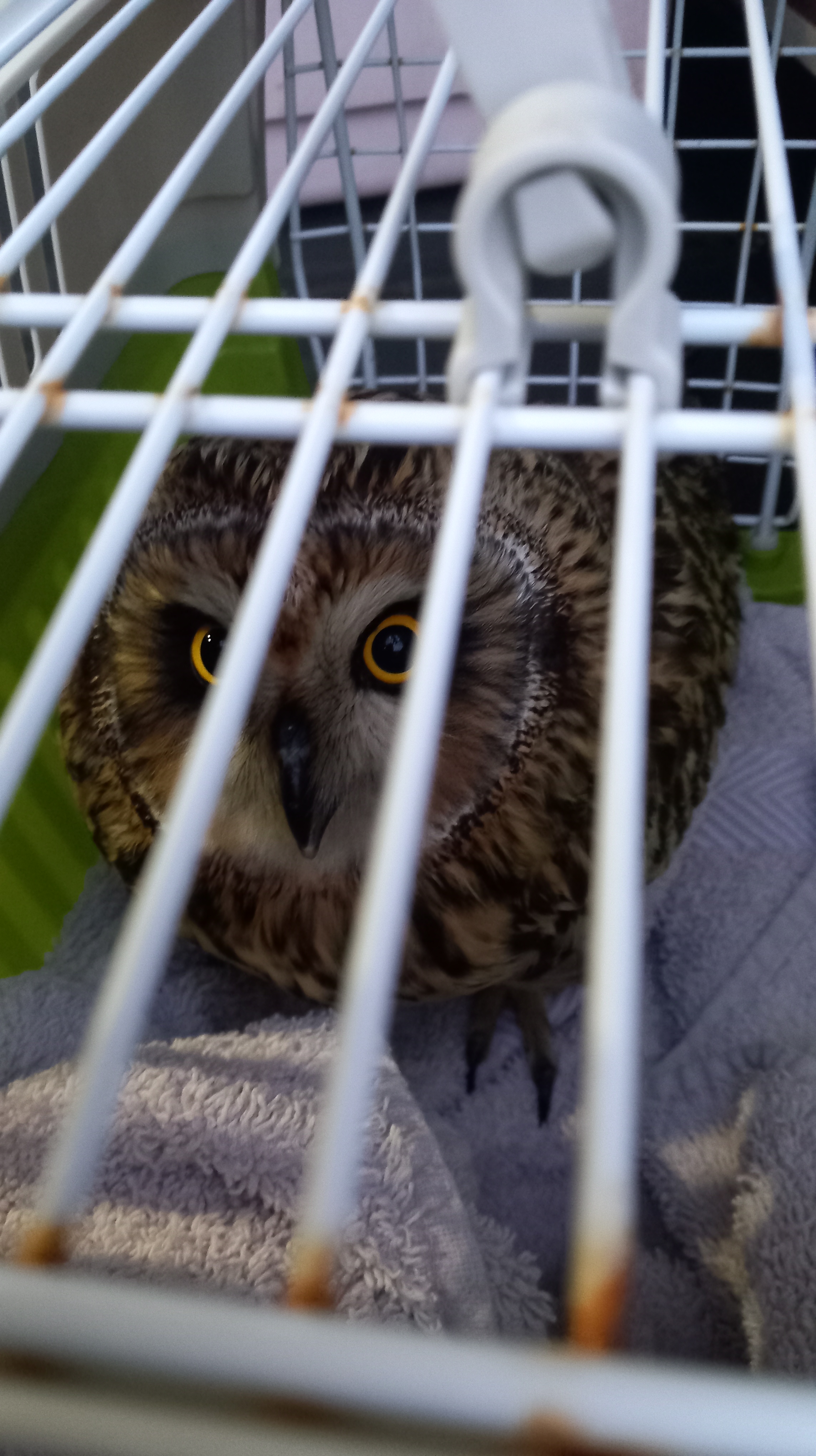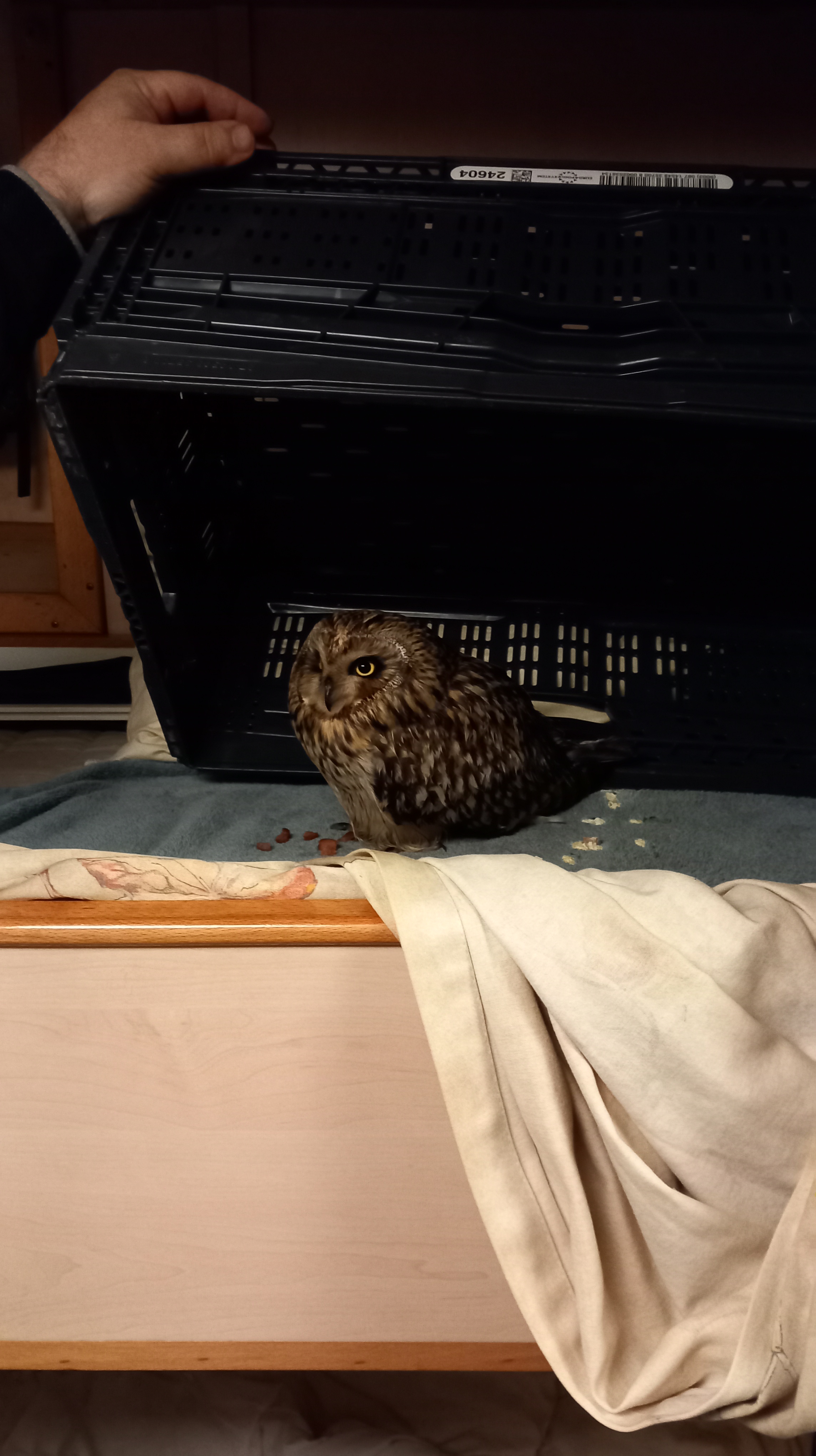 John Buijs: “Bij aankomst werd ik opgewacht door de vissers en inspecteerde ik de uil. De velduil was nog best levendig, ondanks dat het diertje wat vermagerd was en mogelijk ook onderkoeld was geweest. De uil overzetten in een bench vroeg nog best wat handigheid. Hij was namelijk aan het sissen en blazen. Ook heeft hij scherpe klauwen, die mij zo zouden kunnen verwonden.” Gelukkig is dit goed verlopen en kon de uil rustig worden vervoerd naar het hospitaal van Stichting Dierenhospitaal en Ambulancedienst Den Haag.