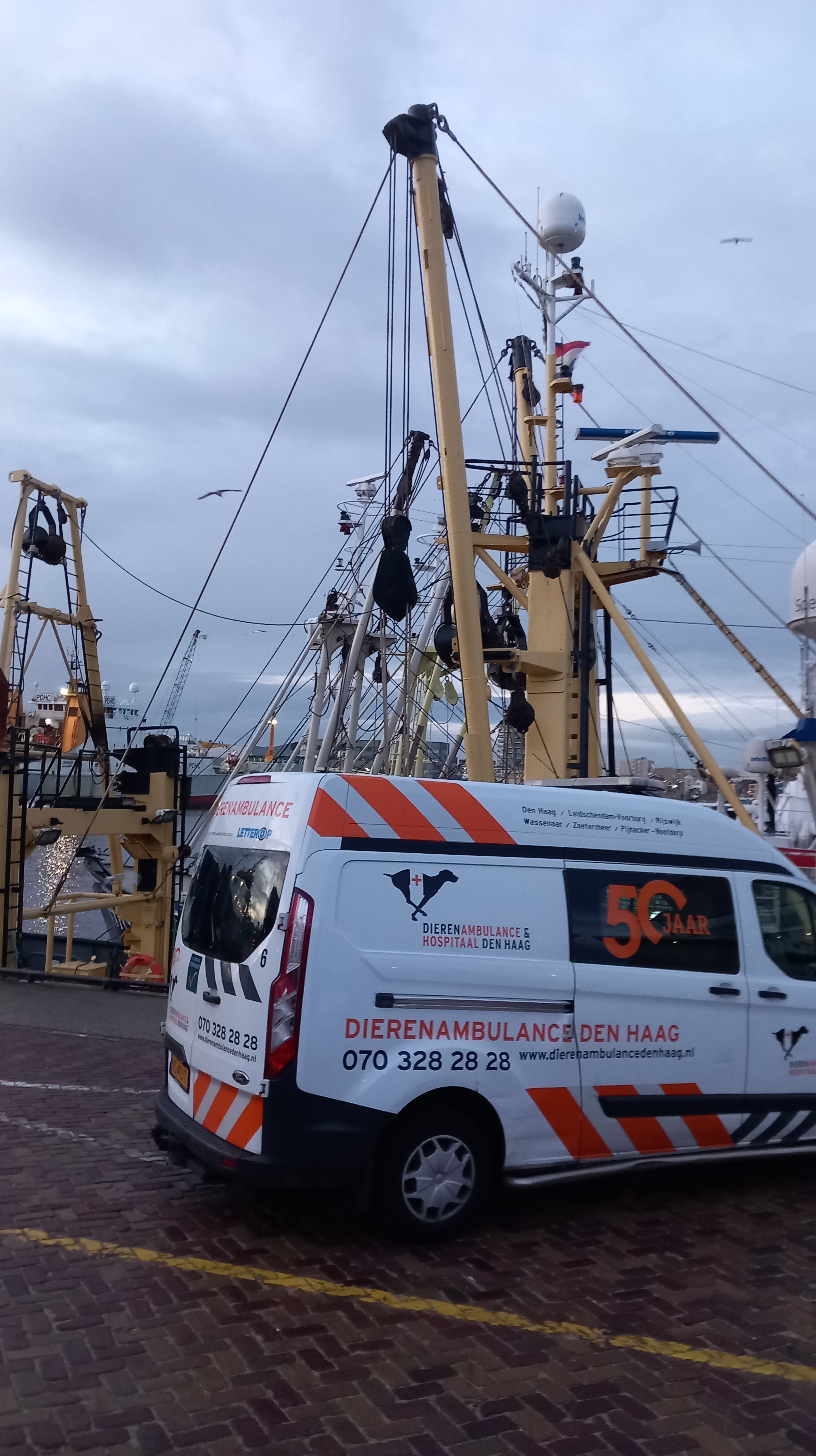 Drie dagen later was de boot terug in Scheveningen en de vissers belden direct de dierenambulance. ‘s Ochtends vroeg kwam de melding daar binnen en ambulancechauffeur John Buijs reed snel naar de haven.