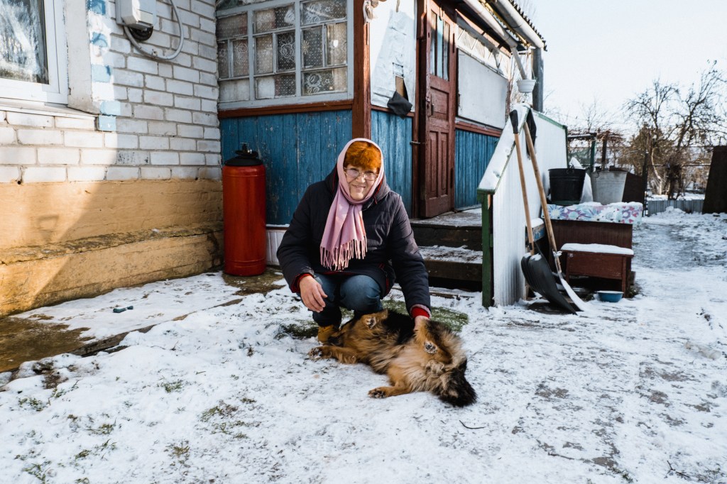 Larysa* (68 jaar), een grootmoeder die alleen in Bucha, vlakbij Kiev achterbleef nadat haar kinderen en kleinkinderen het land ontvluchtten, stopt bakstenen in haar gasoven en legt deze door het huis om het warm te krijgen.