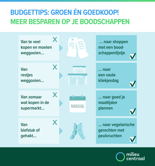 Wil jij geld besparen terwijl je verduurzaamt? Dat kan met de groene budgettips van Milieu Centraal. Door de inflatie betaal je momenteel meer voor eten en drinken. Een extra reden om verspilling te voorkomen en slim boodschappen te doen. Ga voor goedkoper, milieuvriendelijker én creatiever. Kies welke stap jij wilt zetten: van boodschappenlijstjes tot nieuwe vegetarische gerechten koken. Goed voor de aarde, goed voor je portemonnee!