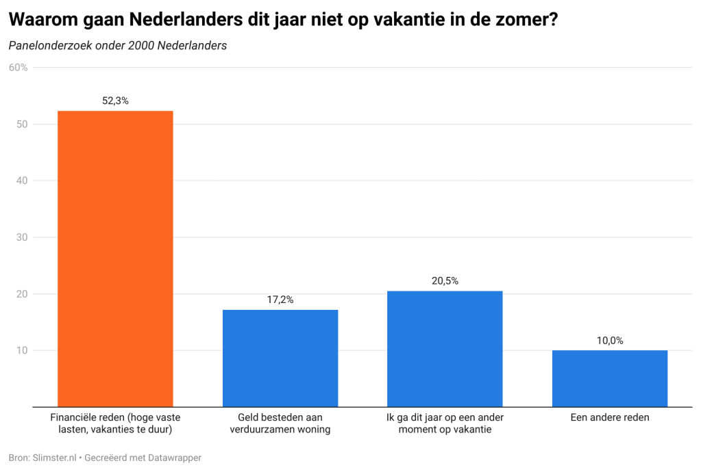 Het onderzoek van Slimster, dat 2000 Nederlanders ondervroeg, laat zien dat met name inwoners van de provincie Drenthe, Groningen en Zuid-Holland dit jaar hun zomervakantie moeten laten schieten. Op leeftijdsniveau valt op dat het vooral de twintigers en dertigers zijn die dit jaar, veelal noodgedwongen, thuisblijven. Al met al noemt liefst 52 procent dat er financiële redenen ten grondslag liggen aan deze beslissing. Ook geeft 20 procent aan dit jaar weliswaar niet in de dure zomermaanden op vakantie te gaan, maar bewust buiten het hoogseizoen.