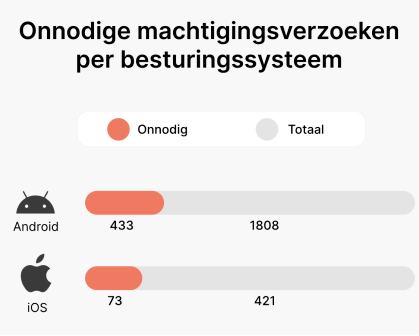 Apps voor sociale netwerken, messaging, navigatie en dating vragen het grootste aantal toestemmingen in vergelijking met andere categorieën. Ze staan ook bovenaan de lijst als het op verzoeken voor onnodige toestemmingen aankomt. Gemiddeld vragen apps voor sociale netwerken om tien onnodige toestemmingen, navigatie-apps om negen, dating-apps om zes en messaging-apps om vijf.