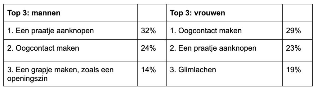 Het onderzoek toont ook aan dat mannen en vrouwen verschillende flirtstijlen hebben. Dus, heb je een oogje op je buurman of buurvrouw en vraag je je af of je een kans maakt? Let dan goed op de signalen. Het zou zomaar kunnen dat jouw favoriete buur een andere flirttactiek hanteert. De top drie manieren van flirten zijn: