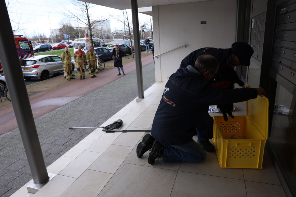 Om te helpen werd ook de brandweer ingeschakeld. De bemanning van kazerne Scheveningen kwam ter plaatse om bijstand te verlenen. Maar zelfs zij slaagden er aanvankelijk niet in om de kat te bevrijden.