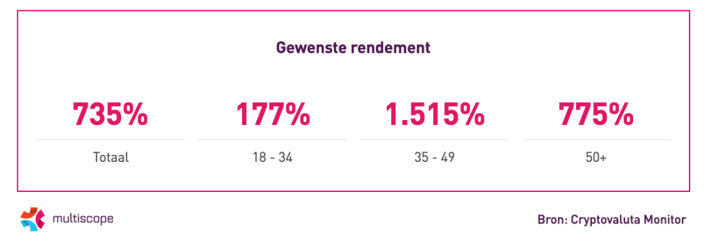 Cryptobezitters van 18 tot 34 jaar verkopen hun portefeuille bij een gemiddeld rendement van 177%, terwijl 35- tot 49-jarigen dit pas doen bij een rendement van 1.515%. Deze laatste groep wenst hiermee veruit het hoogste rendement. 50-plussers streven naar een rendement van 775%.