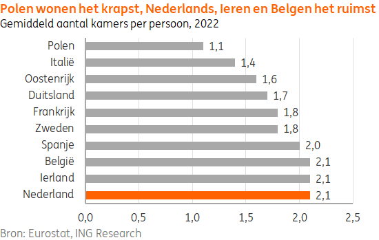 Een ander kenmerk van de Nederlandse woningmarkt is dat we relatief veel kamers per inwoner hebben, gemiddeld 2,1 kamer per persoon. Alleen Belgen en Ieren hebben ook een dusdanig aantal kamers tot hun beschikking. Vooral Polen wonen krap, met slechts net iets meer dan één kamer per persoon en ook de Italianen en Oostenrijkers hebben in huis relatief weinig privacy.