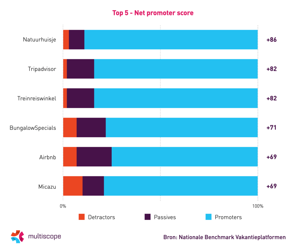 Nederlanders zijn dik tevreden over vakantieplatformen. De platformen scoren een gemiddelde NPS van +63. De Net Promoter Score is een maatstaf voor het meten van klanttevredenheid. Natuurhuisje heeft de hoogste NPS (+86) en Trivago de laagste (+44). Dit blijkt uit de Nationale Benchmark Vakantieplatformen, een grootschalig onderzoek van Multiscope onder ruim 6.000 Nederlanders.