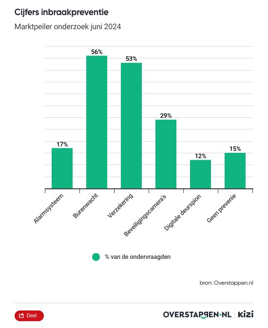 Als het gaat om preventieve maatregelen, blijkt de buurtwacht de populairste keuze. 56% van de Nederlanders vertrouwt erop dat hun buren een oogje in het zeil houden tijdens hun afwezigheid. Daarnaast heeft 51% een aanvullende verzekering afgesloten om zich tegen inbraak te beschermen. Bijna 30% van de Nederlanders maakt gebruik van beveiligingscamera’s om hun huis in de gaten te houden.