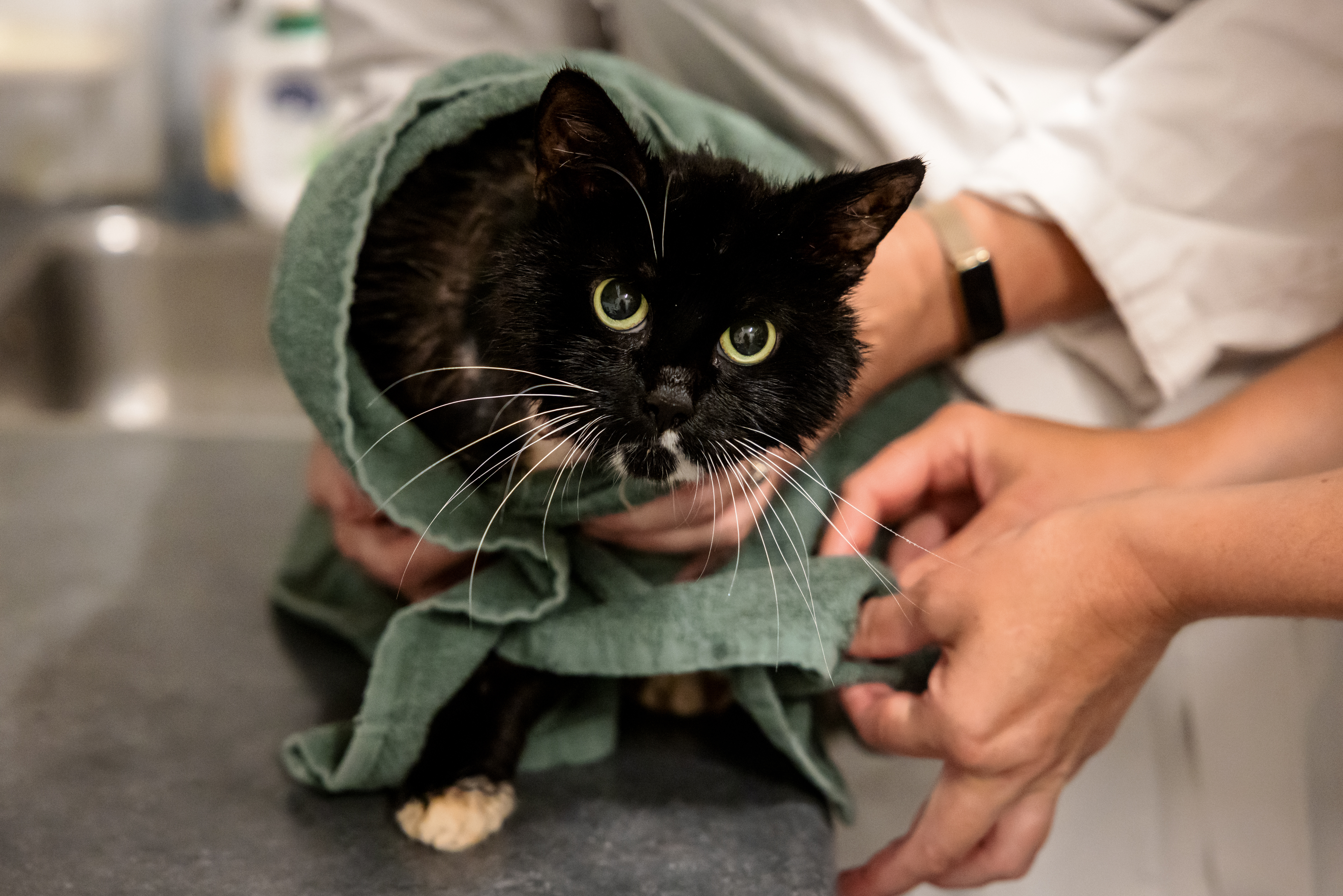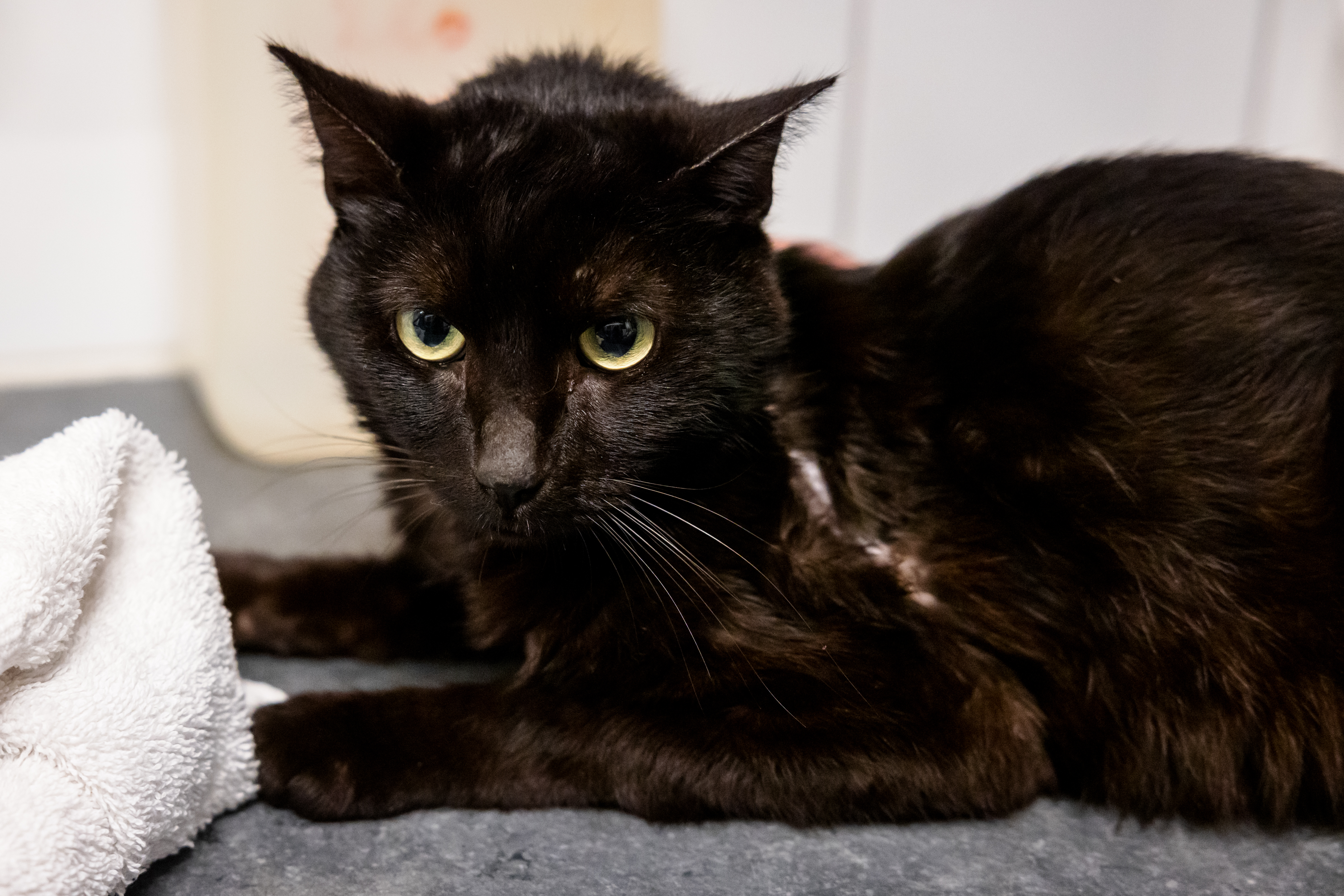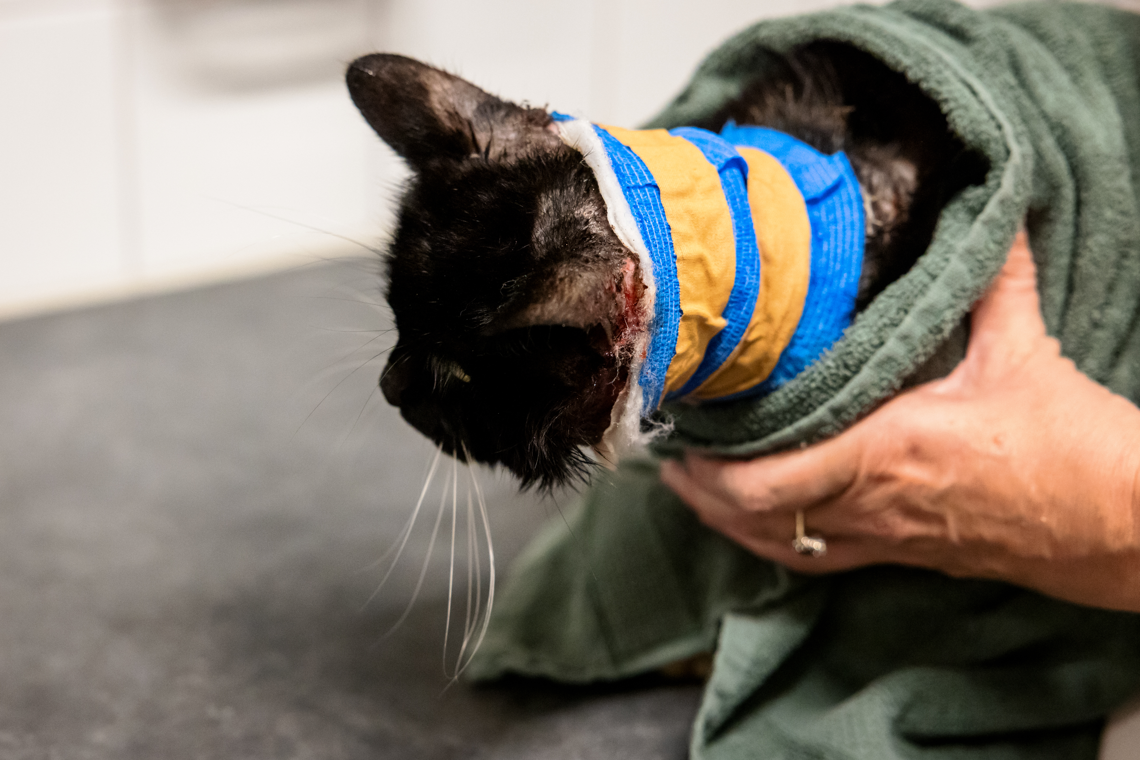 Stichting Dierenhospitaal en Ambulancedienst ’s-Gravenhage heeft deze maand twee zwaargewonde zwarte katten opgehaald: kater Axila, met een flinke wond in zijn oksel, en Rafaël, met een enorme wond rondom zijn nek, van zijn oren tot zijn rug. Beide katten zijn niet gechipt en de eigenaren zijn vooralsnog onbekend.