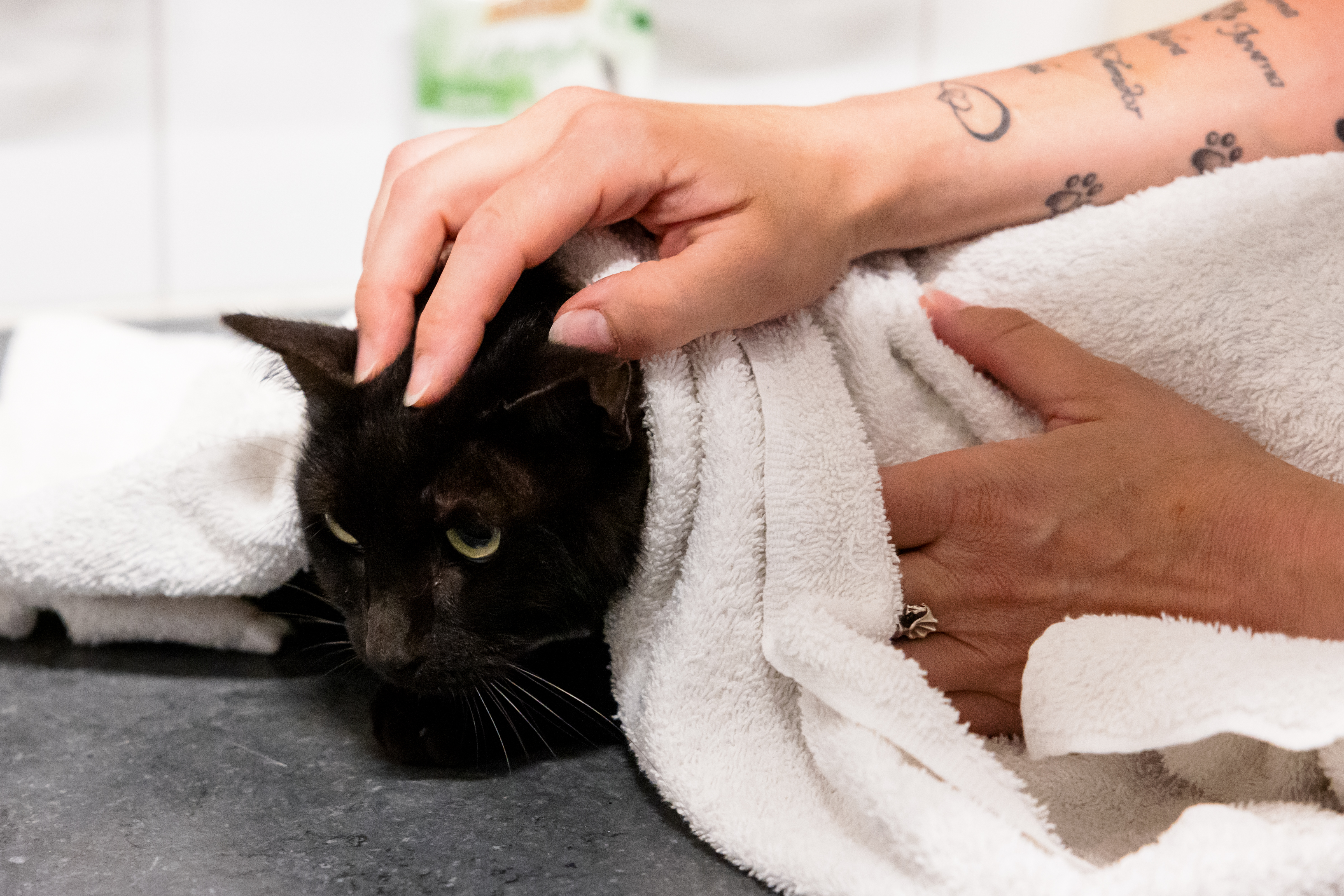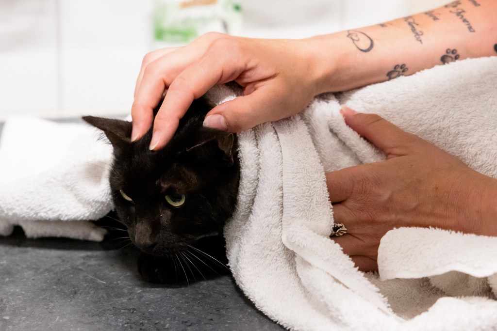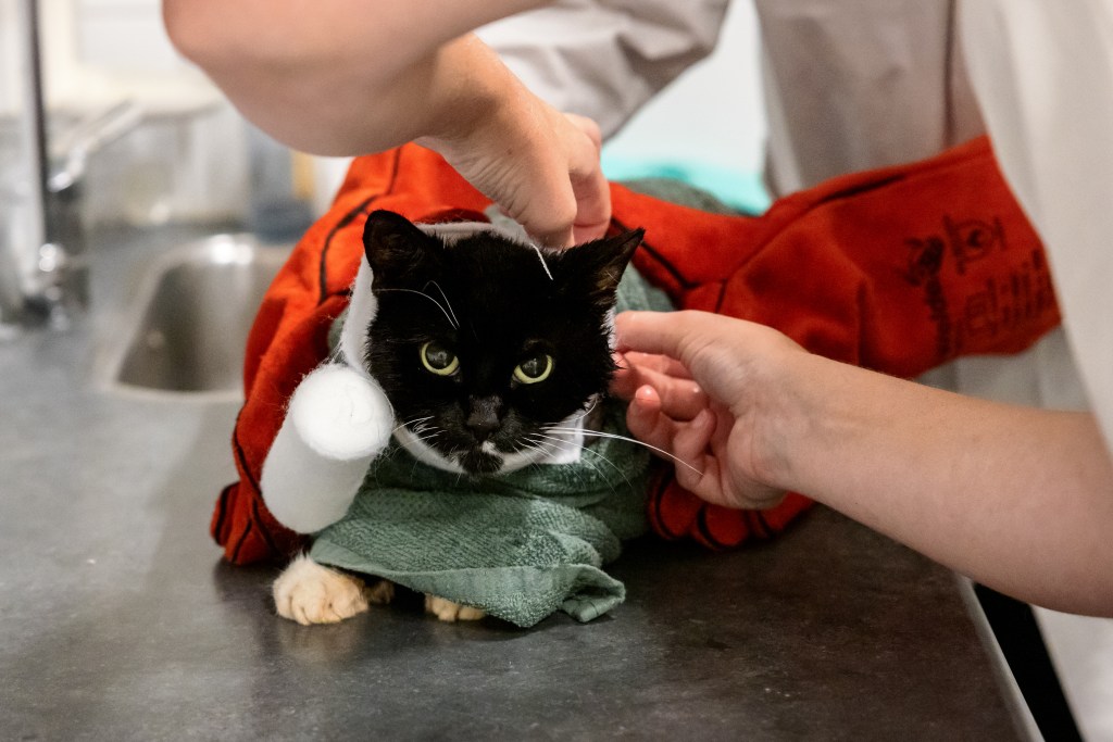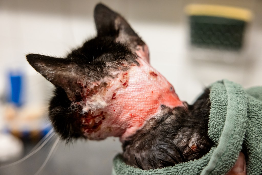Stichting Dierenhospitaal en Ambulancedienst ’s-Gravenhage heeft deze maand twee zwaargewonde zwarte katten opgehaald: kater Axila, met een flinke wond in zijn oksel, en Rafaël, met een enorme wond rondom zijn nek, van zijn oren tot zijn rug. Beide katten zijn niet gechipt en de eigenaren zijn vooralsnog onbekend.