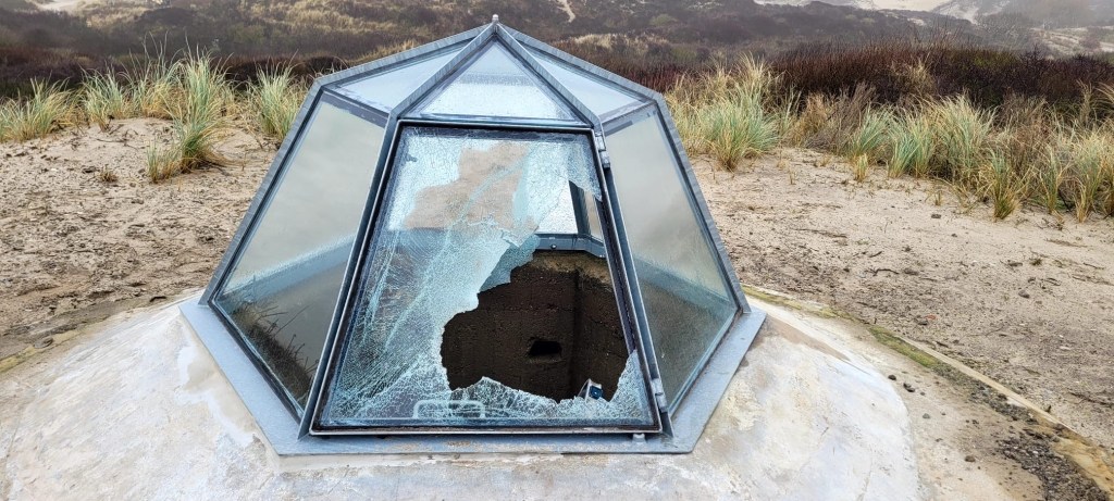 Zwaar ontdaan waren de vrijwilligers van het museum toen zij op 17 januari de zojuist gerestaureerde glazen koepen van het museum in de duinen van Kijkduin in scherven aantroffen. Vandalen hadden zware basaltblokken door de koepel gegooid. De koepel vormde het dak van een zogenoemde Flugwache: een observatiepost voor Duitse soldaten in de oorlog. Vanonder de koepel hielden zij het luchtruim boven Den Haag in de gaten.