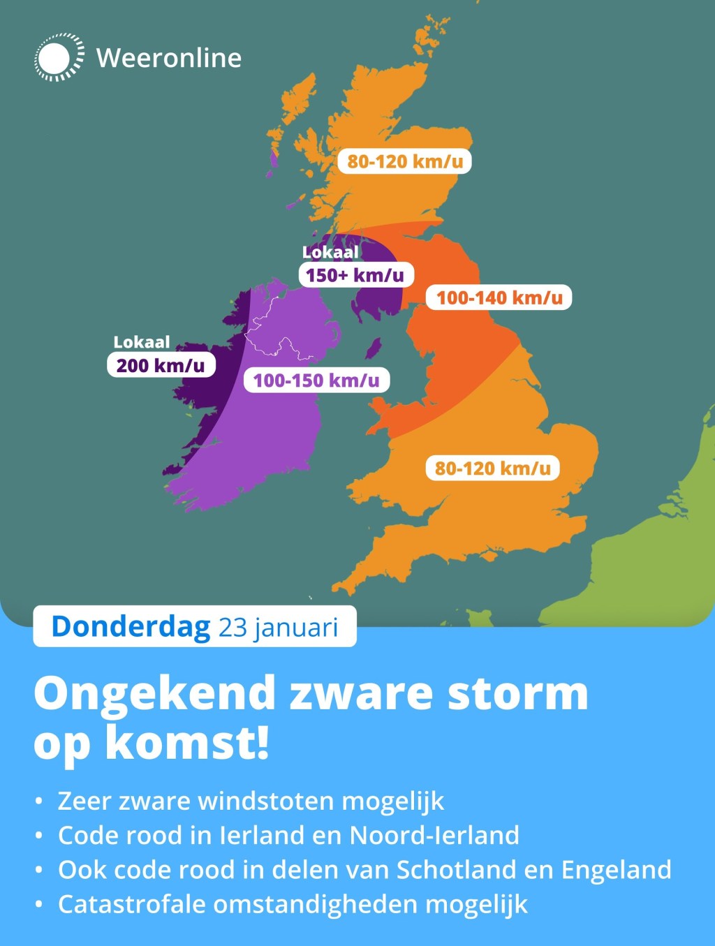 Een zeer zware storm trekt vannacht richting Ierland en het Verenigd Koninkrijk met mogelijk catastrofale omstandigheden tot gevolg. In Ierland en Noord-Ierland is overal een weeralarm van kracht en ook in delen van Engeland En Schotland is sprake van een code rood. Er wordt gewaarschuwd voor zeer zware windstoten die aan de Ierse kust op kunnen lopen tot ver boven de 150 km/uur.
