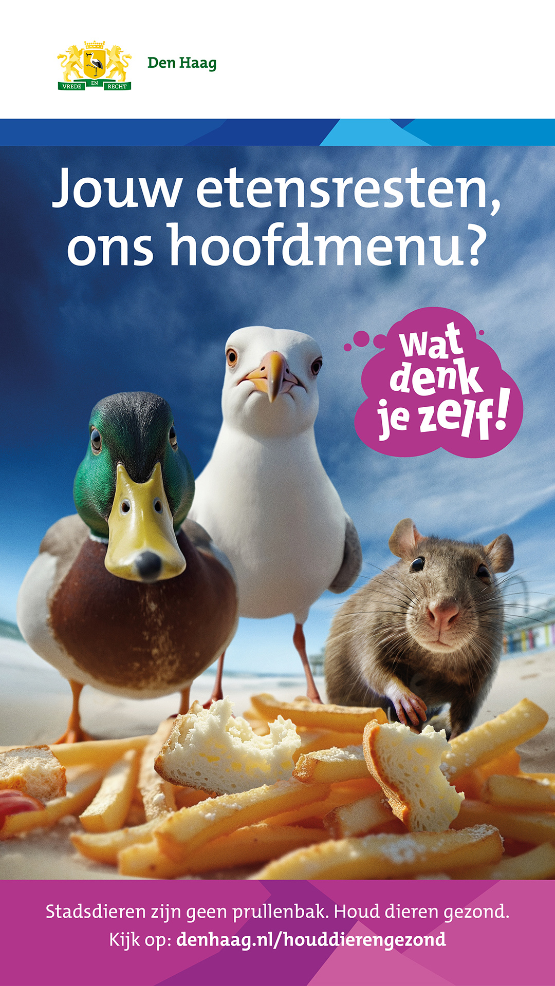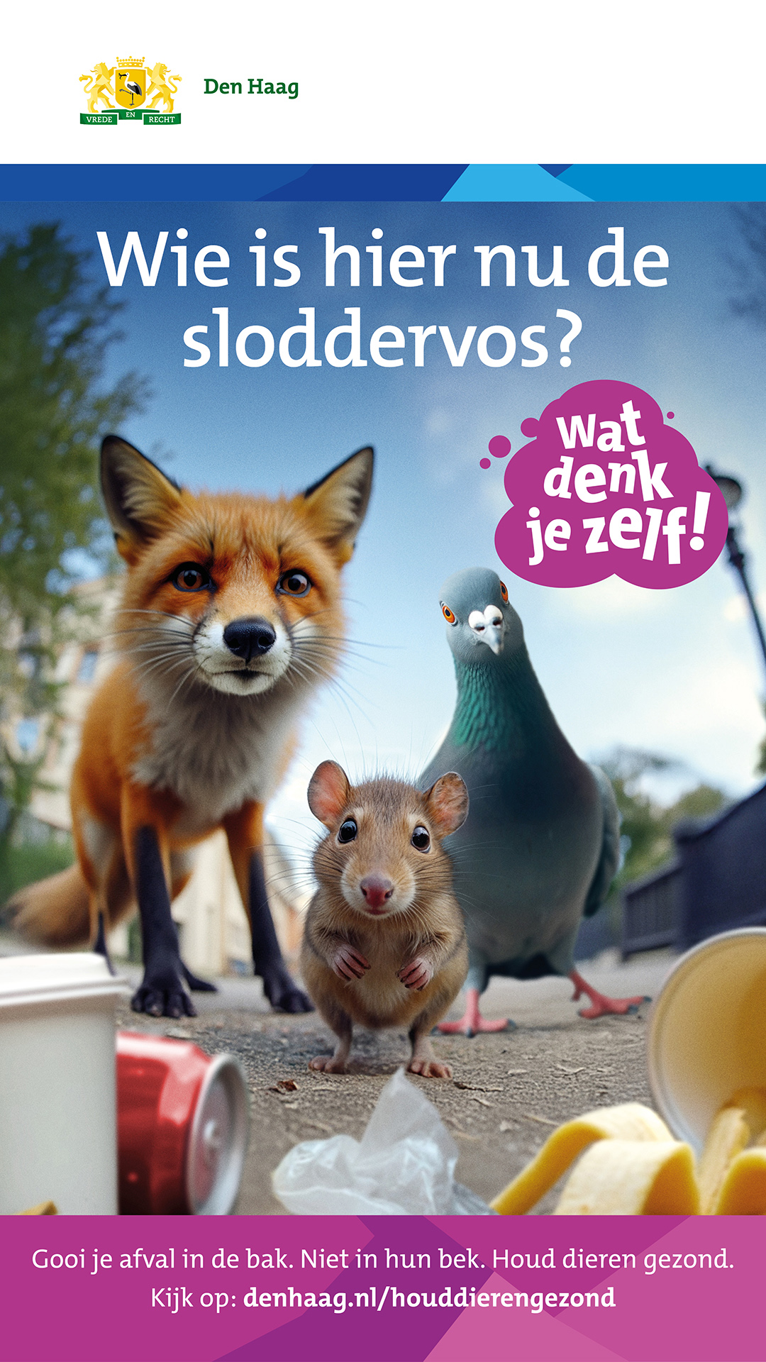 In een nieuwe campagne wijst de gemeente Den Haag inwoners op de gevolgen van voedsel en zwerfvuil op dieren. Met confronterende vragen als ‘Jouw etensresten, ons hoofdmenu?’ en ‘Wie is hier nu de sloddervos?’ met daarna de oproep ‘Wat denk je zelf!’ worden inwoners uitgedaagd na te denken over de impact van hun gedrag. De campagne laat zien dat voeren en afval dumpen dieren niet helpt, maar juist schaadt.