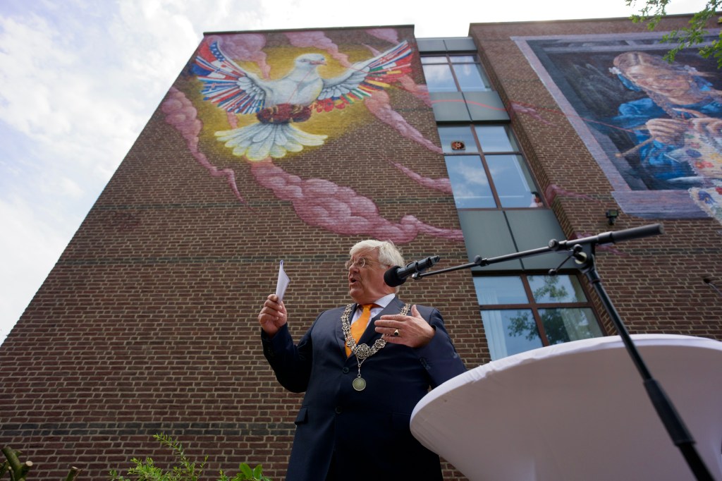 Burgemeester Jan van Zanen heeft zondagmiddag aan de Stadhouderslaan in Den Haag de inmiddels traditionele NAVO-muurschildering onthuld, dit keer naar ontwerpen van de Estlandse kunstenaar Riivo Kruuk en de Nederlander Diederik Dijkgraaf. In elke stad die ruimte bood aan een NAVO-top, is zo’n muurschildering te vinden. In Vilnius, in Washington en nu dus ook in Den Haag.