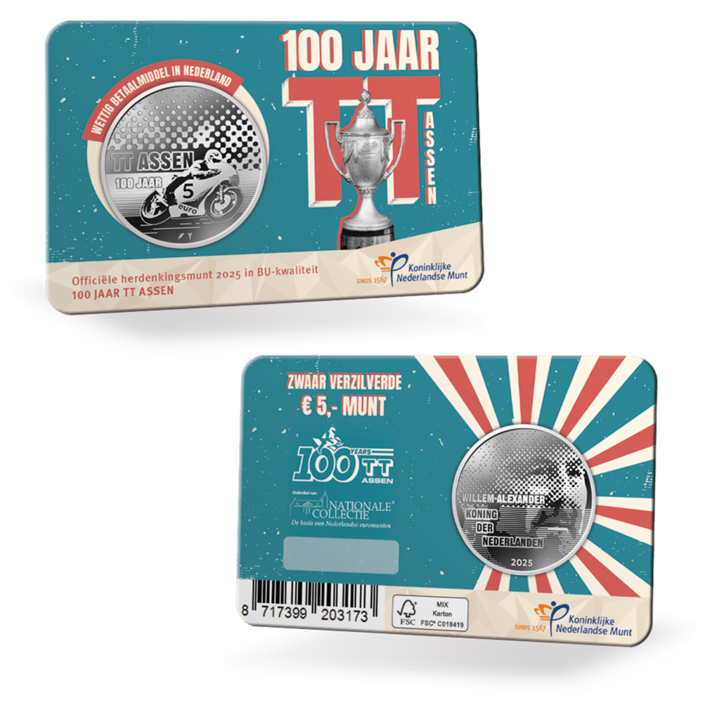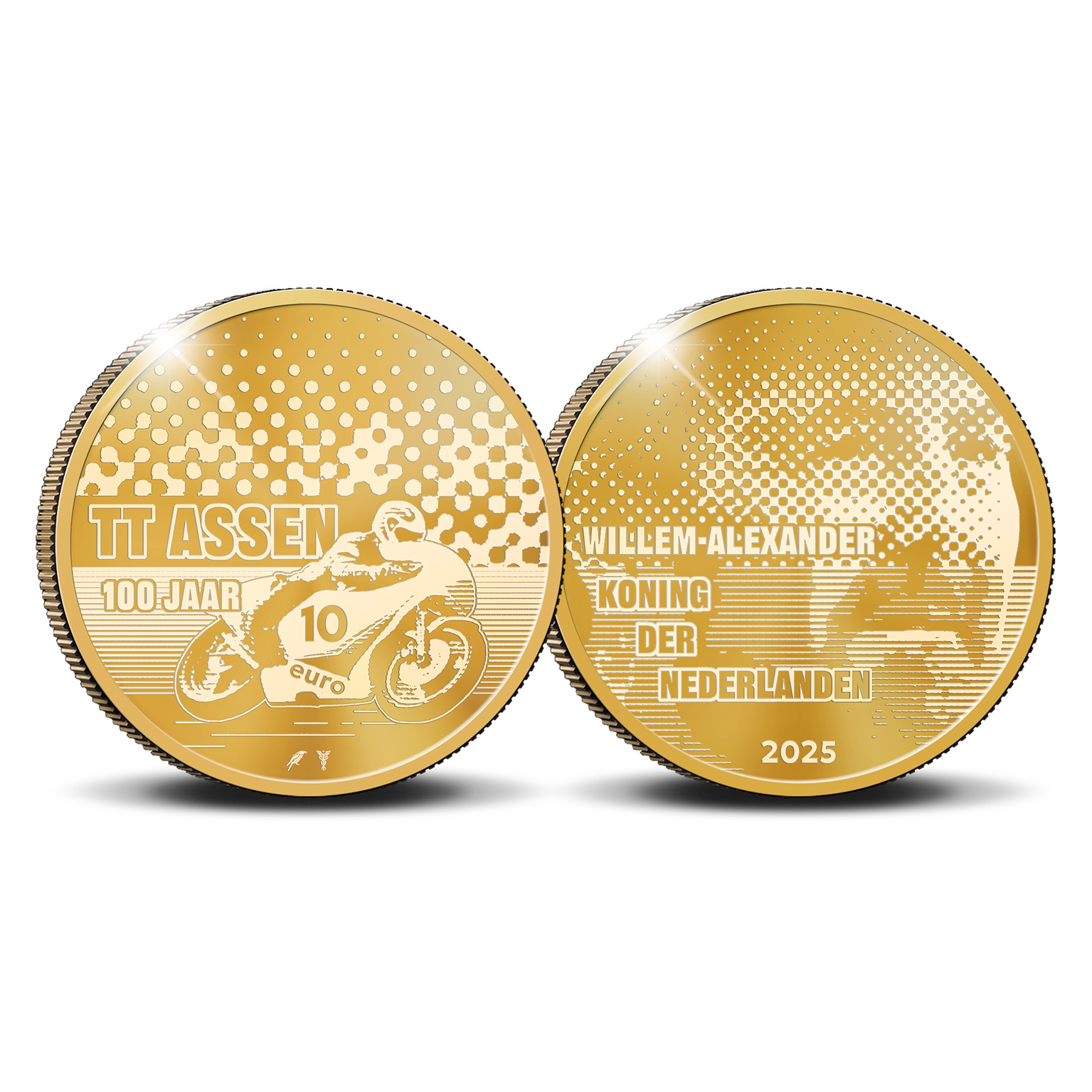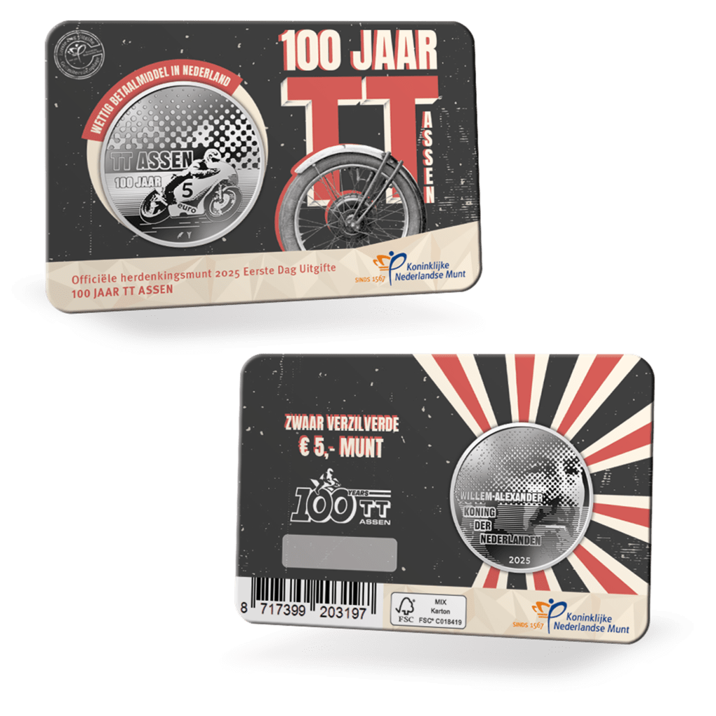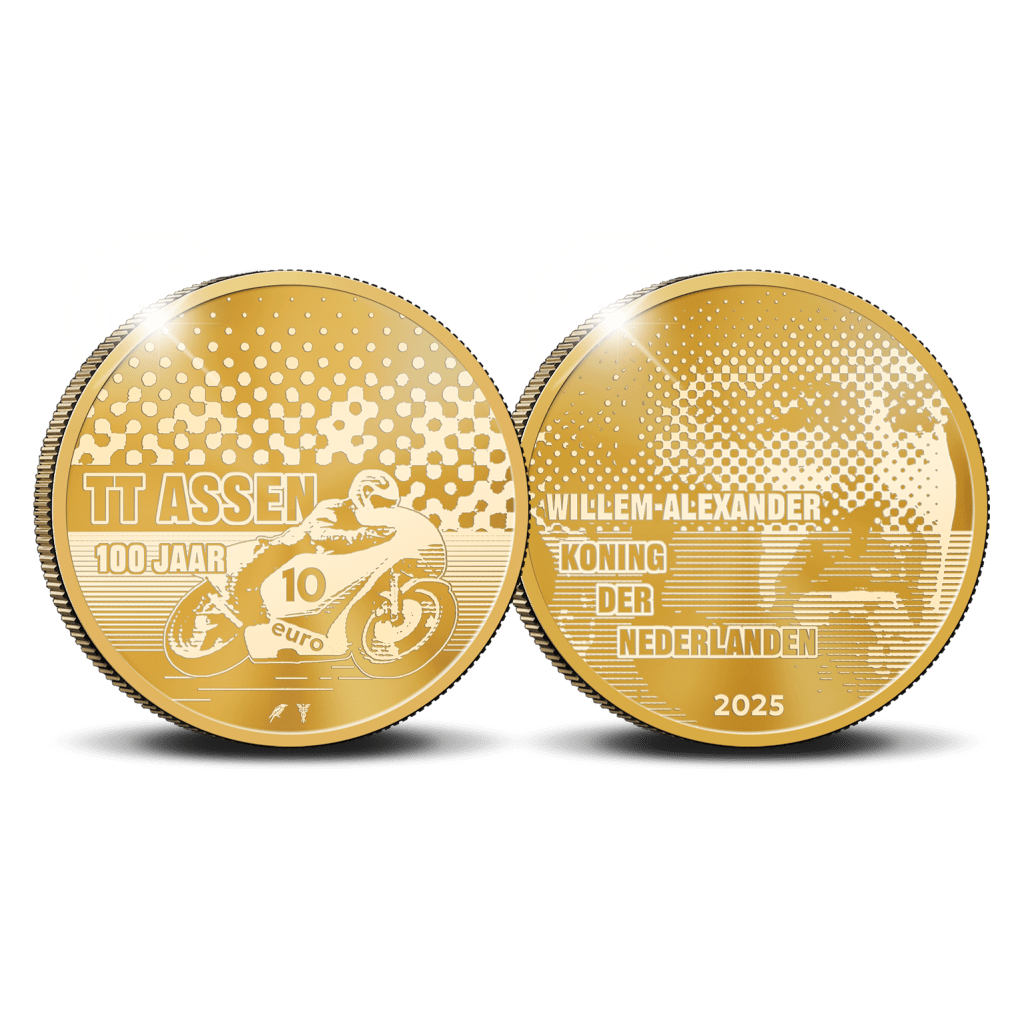 Op 23 juli 1925 werd de allereerste race gereden in Assen en dit markeert in 2025 het 100-jarig jubileum van het circuit. Na afsluiting van de eerste vrije training van de MotoGP werd de munt op het podium naast het circuit geslagen. Minister van Financiën, Eelco Heinen is trots op de toevoeging van deze iconische munt aan het rijtje van herdenkingsmunten: “De TT Assen is een mooi voorbeeld van hoe iets dat klein begint, uit kan groeien tot een feest met een grote internationale uitstraling. Het is dan ook niet meer dan terecht dat de TT vandaag een herdenkingsmunt krijgt.”