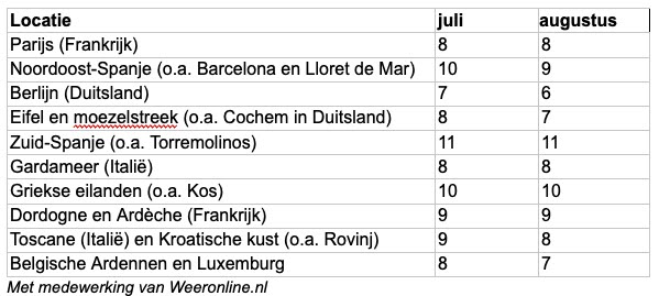 Waar in Nederland de zonkracht in juli en augustus op kan lopen tot 8, is de gemiddelde zonkracht in het zuiden van Europa een stuk hoger. Op de meest populaire vakantiegebieden, volgens de bezoekersaantallen op Weeronline, kan de zonkracht daar in de vakantiemaanden oplopen tot 11.