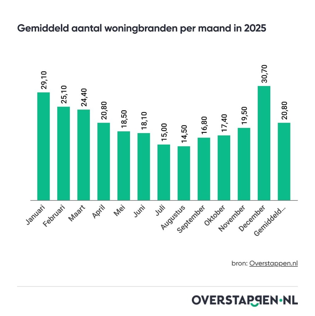 De maandcijfers over 2025 laten zien dat het risico op een woningbrand verschilt per seizoen. In de wintermaanden ligt het aantal woningbranden ruim twee keer zo hoog als in de zomer. Zo waren er in december 953 branden en in januari 901 woningbranden. In de zomermaanden lagen die aantallen veel lager: in juli waren er 464 woningbranden en in augustus 448 branden. Broekman ziet dat meerdere oorzaken een rol spelen bij de toename in de winter. “Het risico op woningbranden neemt onder andere toe door intensiever gebruik van de verwarming of open haard, elektrische apparaten en kaarsen. Juist in deze maanden kunnen branden zich sneller ontwikkelen en schade veroorzaken. Gelukkig wordt schade aan de woning zelf (zoals muren, dak, vloeren en vaste installaties) bij een brand meestal gedekt door de opstalverzekering. Het is belangrijk om goed zicht te hebben in de dekking van je woonverzekering, want bij een brand kunnen de kosten hoog oplopen.”