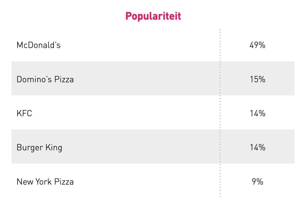 McDonald’s is met afstand de populairste fastfoodketen. Bijna de helft van 18 jaar en ouder (49%) heeft het afgelopen jaar de fastfoodketen bezocht. Omgerekend zijn dit ruim 7,2 miljoen Nederlanders. Domino’s Pizza is met 15% de op één na populairste keten. Kort daarop volgen KFC (14%) en Burger King (14%). Tot slot maakt New York Pizza (9%) de top vijf compleet.