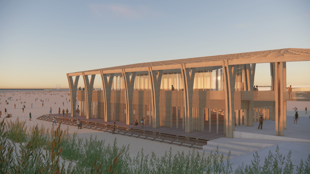 Beelden: Impressies van het schetsontwerp voor het permanente Beachstadion. Gemaakt door Bureau Kroner.