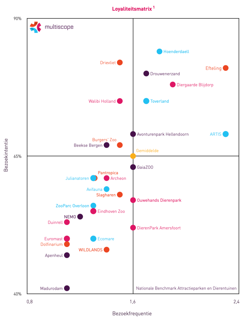 De Efteling, Artis en Diergaarde Blijdorp scoren het hoogst op daadwerkelijke bezoekfrequentie. Opvallend is dat Landgoed Hoenderdaell en Familiepark Drievliet juist het beste scoren op herhaalintentie. Daartegenover blijven Madurodam en Apenheul op beide vlakken achter.
